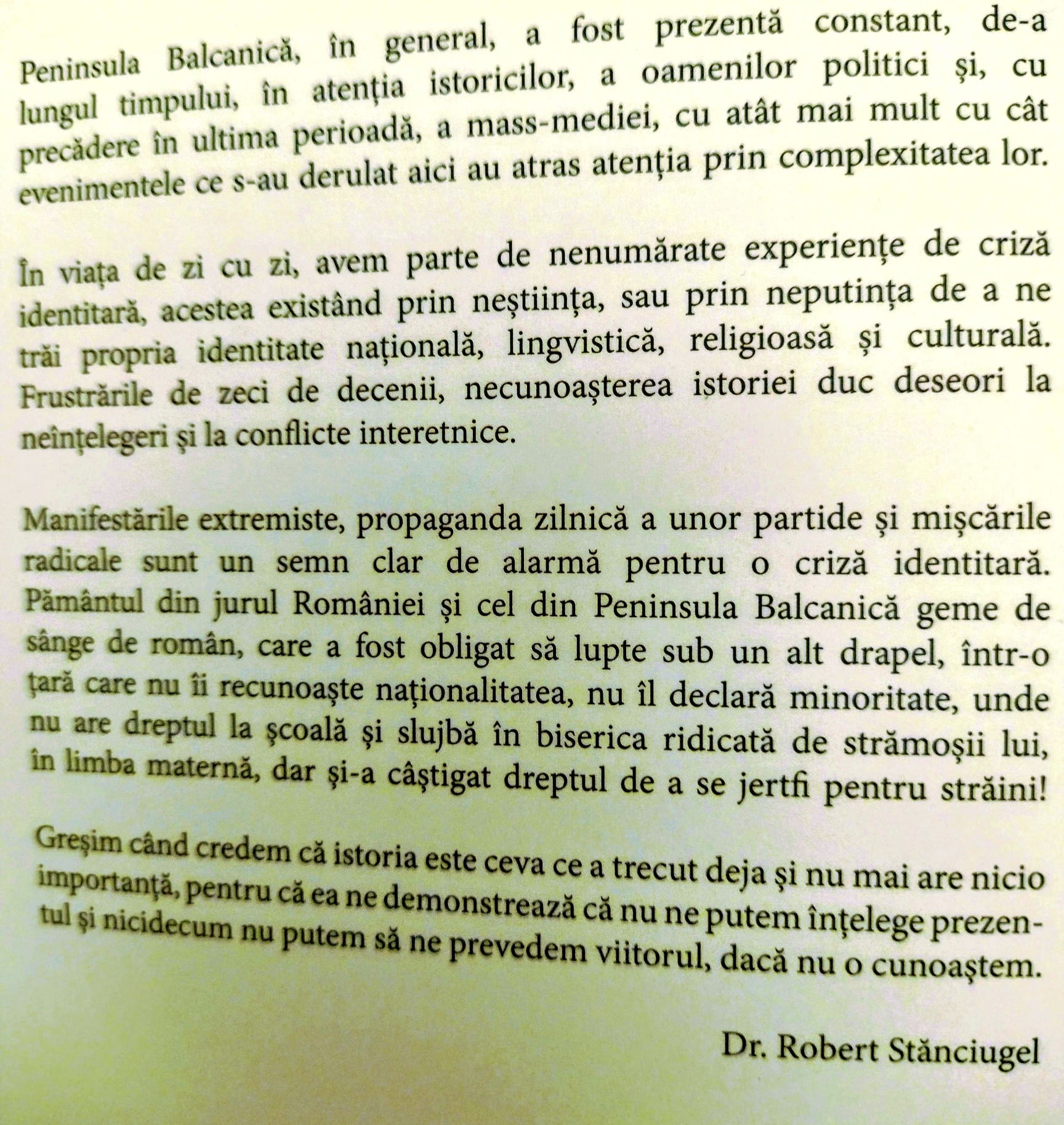 Dr. Robert Stănciugel: „Cunoașterea corectă a istoriei popoarelor europene și balcanice poate asigura o stabilitate în regiunea în care trăim, ne poate ajuta nu numai la autocunoaștere ci și la toleranță și înțelegere față de alte popoare. Din punctul meu de vedere și nu numai al meu, România este raiul minorităților: toate minoritățile din România au școli și biserici în limba maternă, au propriile clădiri în care își desfășoară cursurile școlile cu predare în limba maternă, au propriile biserici în care se roagă în limba maternă, au sedii în care își desfășoară activitatea centrele culturale ale minorităților, teatre și altele.