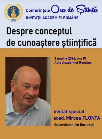 Academia Română invită publicul marți, 3 martie 2026, ora 18, la conferința „Despre conceptul de cunoaștere științifică“, susținută de academician Mircea Flonta, membru titular al Secției de filosofie, teologie, psihologie şi pedagogie, profesor emerit al Universității din București.