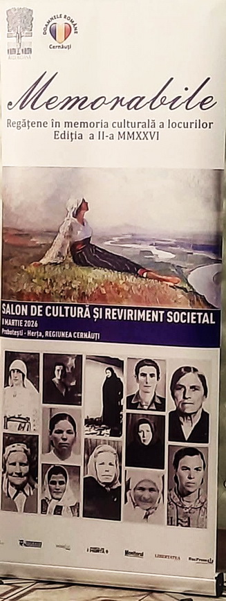 MARIA CALANCEA: Excelenţele Voastre, preacucerniciile voastre, distinse doamne, domniţe şi distinşi domni, vă spun BUN VENIT la cea de-a doua ediţie a Salonului de cultură şi reviriment societal ,,Regăţene în memoria culturală a locurilor”, un eveniment anual în cadrul căruia ne propunem să omagiem predestinarea de a fi femeie, astăzi, printr-o incursiune în memoria culturală a Proboteştilor din Ţinutul Herţa al regiunii Cernăuţi, înlesnind o reîntâlnire cu istoria, cu memoria locurilor, cu amintirea unor femei ale locului – DOAMNE ROMÂNE REMARCABILE care ne inspiră până astăzi prin dorinţa de a zidi pentru generaţiile viitoare, femei supuse persecuţiilor staliniste, femei deportate în Siberiile de gheaţă, femei şi tinere fete duse la muncă silnică şi grea în Donbas, DESTINE care aduc mărturie despre vremuri, locuri şi, mai ales, despre femeile de altădată care au fost rânduite să poarte o cruce grea pe cărarea de spini şi mărăcini a vremurilor haine care s-au abătut asupra neamului nostru românesc în a doua jumătate a secolului trecut, adevărate VALORI prin caracterul si tenacitatea lor, care au luptat pentru un ideal: păstrarea identităţii româneşti, fiinţarea unei comunităţi în rădăcinile unui neam brav, dar urgisit de încercările venite asupra lui. În calitate de preşedintă a Asociaţiei Centrul pentru Conservarea şi Promovarea Culturii Tradiţionale ,,Arboroasa”, organizaţia care a iniţiat în 2025 salonul de cultură MEMORABILE în localitatea Igești din nordul Bucovinei, am adresat invitaţia de a ne fi parteneră Societăţii Doamnele Române din Cernăuţi condusă de doamna Maria Toacă, una din doamnele române remarcabile prin activităţile de-o viaţă dedicate identităţii românești – în calitate de scriitoare, jurnalistă, publicistă şi eseistă, autoare de cărţi despre cultura românească din Bucovina, redactor la revista „Glasul Bucovinei” Cernăuţi-Bucureşti, distinsă cu Ordinul „Meritul Cultural” în grad de Cavaler pentru Promovarea Culturii acordat de preşedintele României în 2025 — o invitaţie care a primit răspuns favorabil, concretizându-se într-o frumoasă colaborare pentru onorarea locurilor memoriei româneşti.