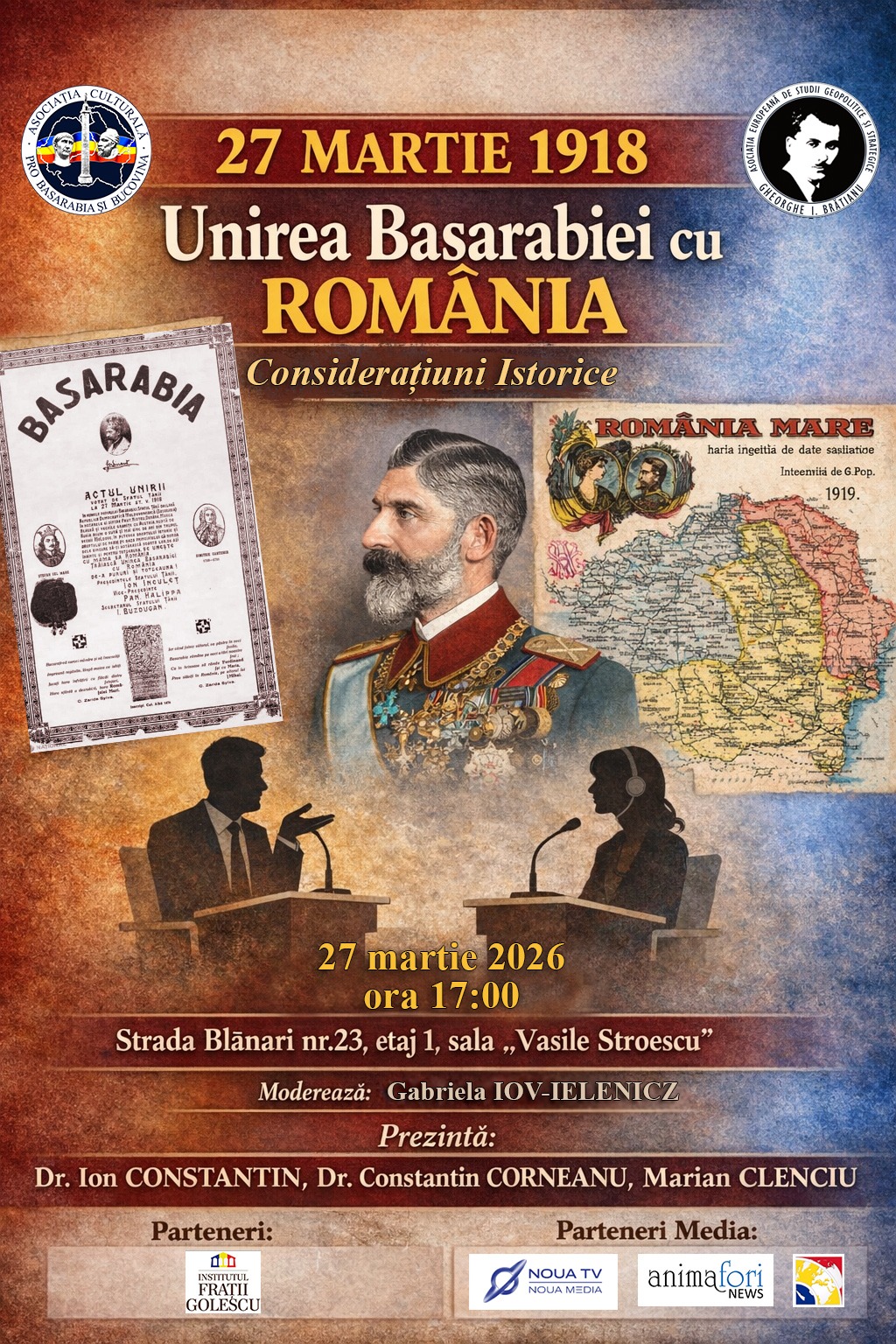 Evenimentul va avea loc în data de 27 martie 2026, ora 17:00, la adresa Strada Blănari nr. 23, etaj 1, sala „Vasile Stroescu”, și își propune să ofere un cadru de dezbatere și analiză asupra contextului istoric, politic și geopolitic al Unirii Basarabiei cu România.